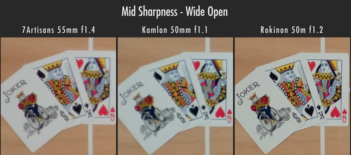 Already the Kamlan is starting to fall apart when moving out from the center. The 7 Artisans sits between the Rokinon and the Kamlan.