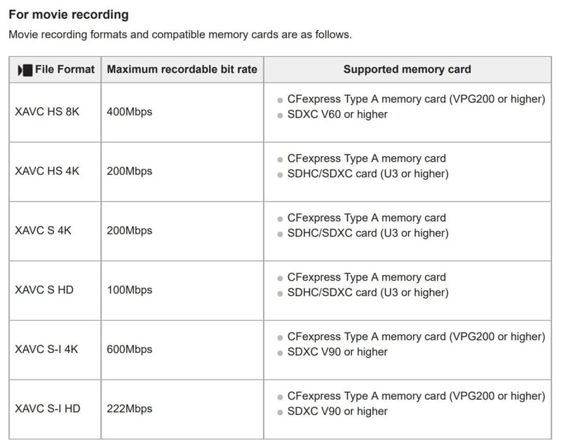 However, V60 SD cards are great for casual or landscape photography and perform well with HEVC video codecs. But if you want to use the H.264 All-I codec, you will need V90 SD cards or CFxA cards to shoot the 600Mbps H.264 bitrate and some S&Q modes.