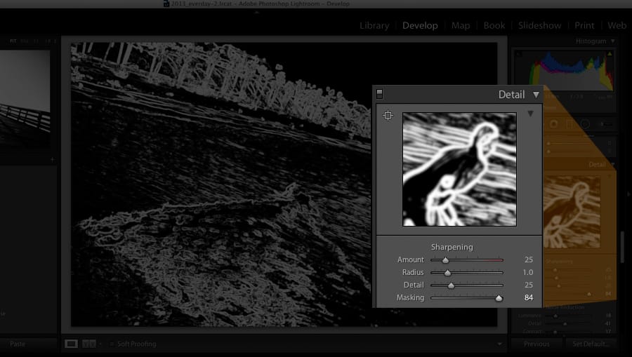 Find the Masking slider and hold down Alt (Option on Mac) and drag it out. You’ll notice it creates an edge mask around the details of your image that you can now see as long as you hold Alt (Option). The sharpening tool will now only sharpen within the white area. Drag it out until you have the desired area you wish to sharpen and adjust the sharpness amount and detail and you’ll only be affecting the edges within that mask.