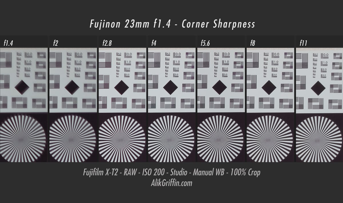 This is my second copy of the Fujinon 23mm f1.4 and my last copy (before it died) was a little bit better in the corners. My new copy is very slightly decentered so it may be possible to get better results than this with a new 23mm f1.4.