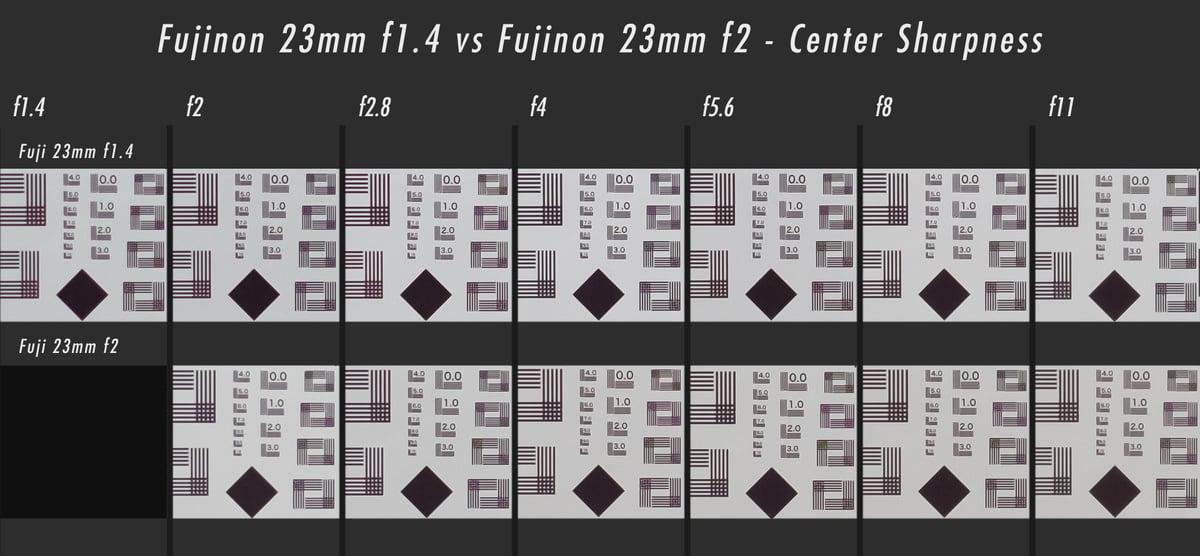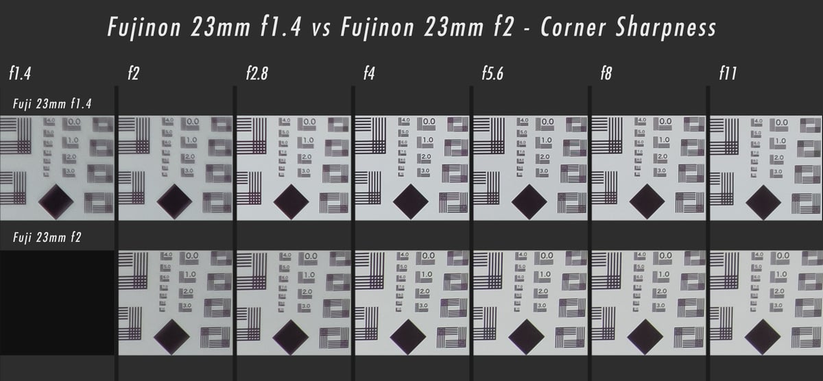 Corners are better on the 23mm f1.4 but not by a lot. The f1.4 lens does have less of a shift in the colors and isn’t hit as hard by vignetting. At f2, the Fujinon 23mm f2 performs better when looking at sharpness alone.