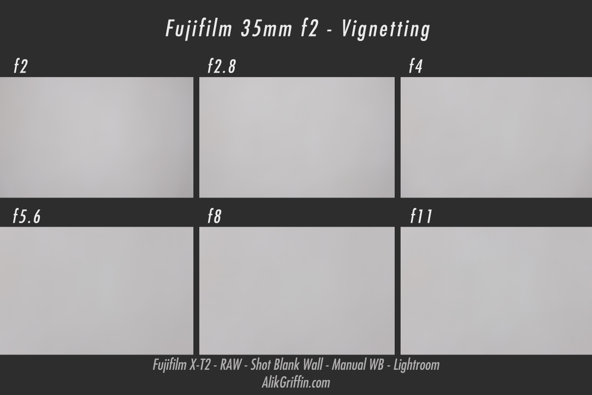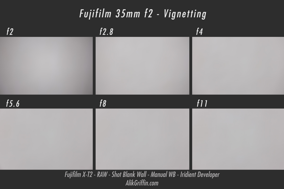 Without the built-in profile, vignetting is still well controlled except at f2 where it is most apparent on the left and right edges.