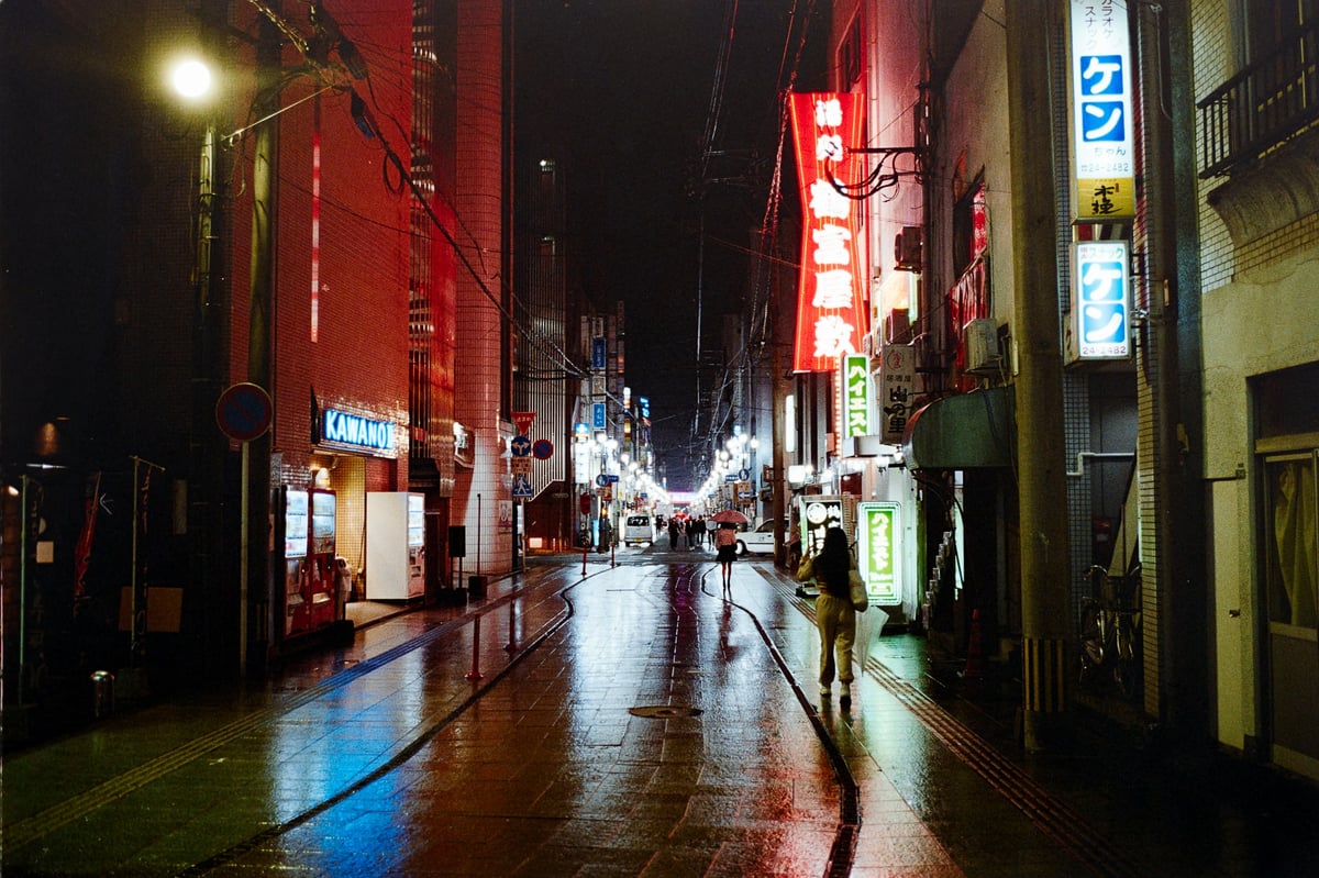 Film also shifts certain frequencies of light around in a way that digital never would. For example, the street light casts a green luminance on the scene, but the lights in the background are not green. If I shot this digitally, this street light in the foreground would not be nearly as yellow/green, but probably more of a lime green. Look at how saturated the reds are.