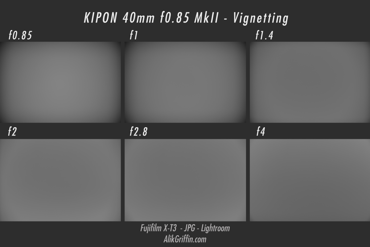 Some corner vignetting at f0.85 and f1. By f1.4, vignetting is reasonable, and by f2, the vignetting is actually brighter along the edges.