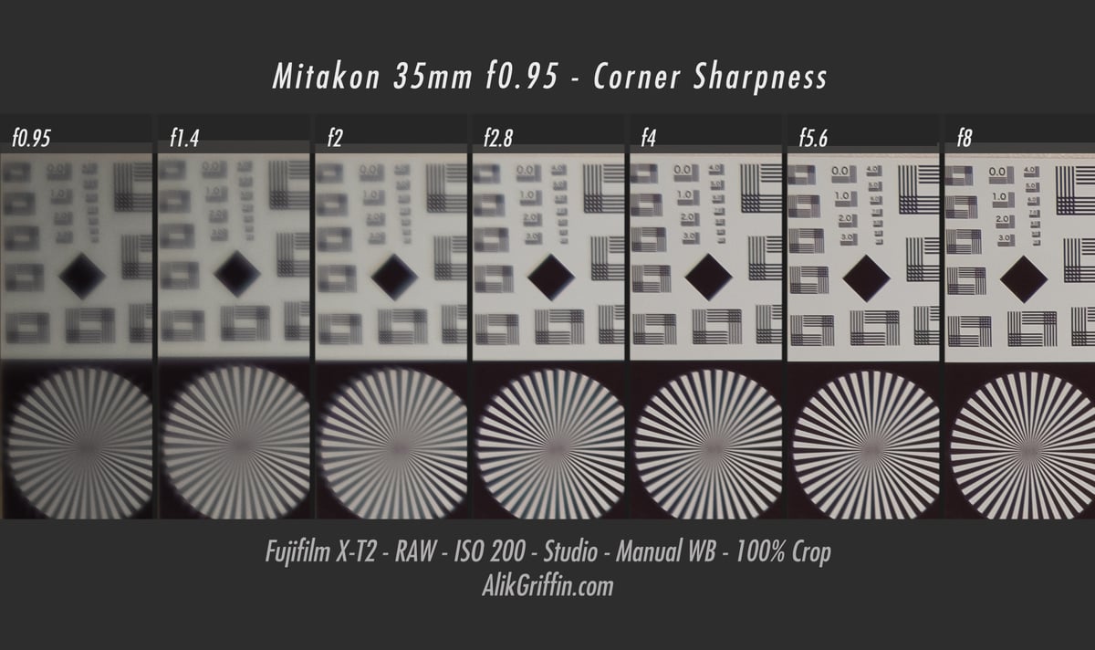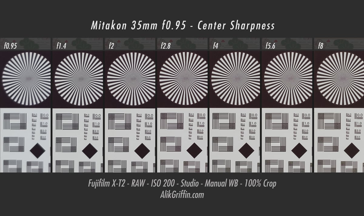 On my copy with this chart, the Kipon is slightly sharper at f0.85 than the Mitakon at f0.95. But it’s close, there is copy-to-copy variation and it’s extremely difficult to get perfect results on a test chart with lenses this fast.
