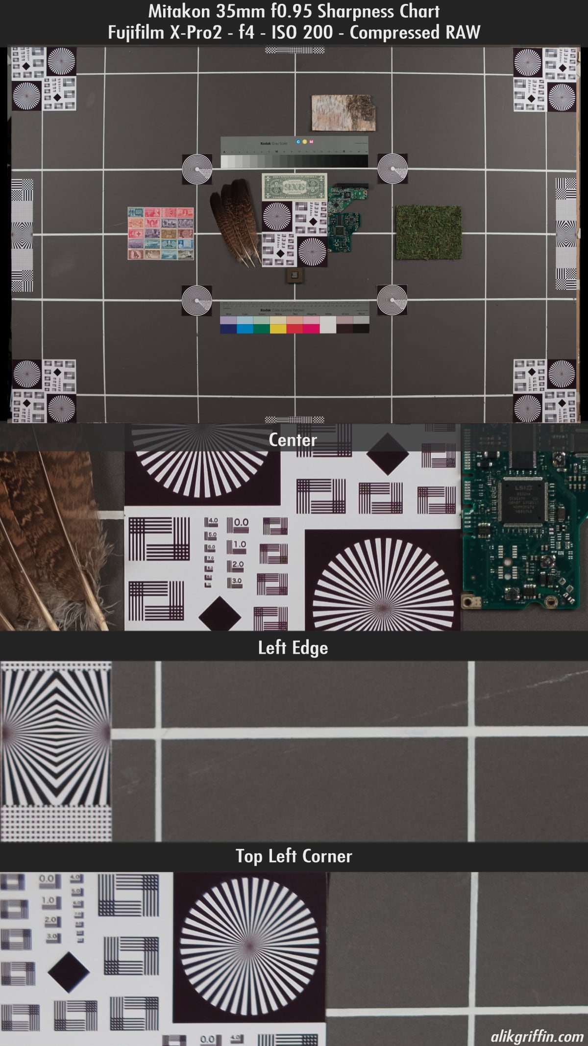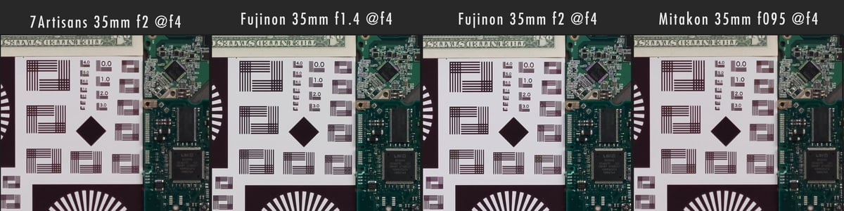 Stop down to f4, and the Fujinon primes pick up their performance. The Mitakon 35mm has about the same sharpness as the Fujinon 35mm f1.4, but the 35mm f2 is a touch sharper.