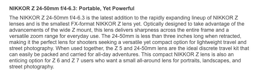 Here are the NIKKOR Z 24-50mm f4-6.3 Specs
