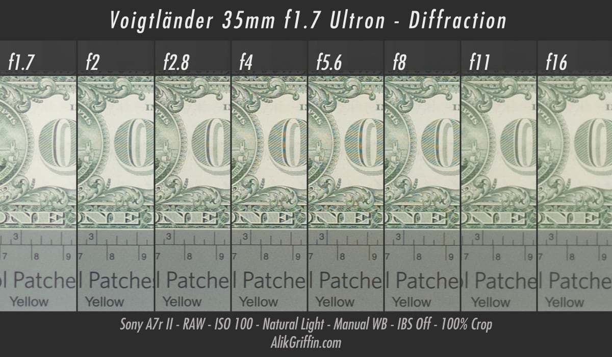 Focus shifting is when the focus changes slightly as you change your aperture. If you’re focused at f/1.7, you might not be in focus when you change your aperture to f/5.6. I’ve found that to be the case with this lens. When performing the diffraction test, from f/1.7 to about f/5.6, I had to adjust the focus at each aperture setting; otherwise, it would shift as I stopped down. The difference isn’t huge; most people probably won’t notice. However, if you want to be precise, refocusing will make a noticeable difference after adjusting the aperture.